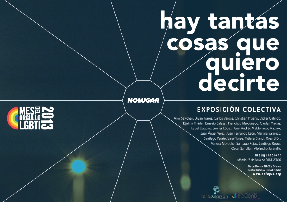 No Lugar – Arte Contemporáneo y La Organización del Mes del Orgullo LGBTIQ+ tienen el placer de invitar a ‘HAY TANTAS COSAS QUE QUIERO DECIRTE’ - exposición de artes visuales en el marco del mes del orgullo LGBTI 2013, que reúne artistas de Ecuador, Colombia, Cuba, Estados Unidos, Brasil y Uruguay.