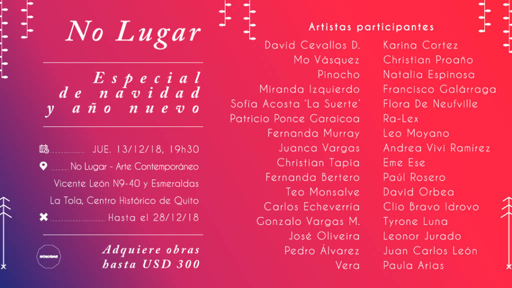 Inauguración: Jueves 15 de noviembre, 19h30. Lugar: Espacio expositivo de No Lugar, Vicente León N9-40 y Esmeraldas, La Tola, Centro Histórico de Quito.Seguir leyendo